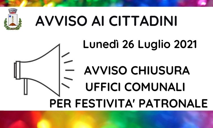 Si comunica che gli uffici comunali Lunedì 26 Luglio 2021 rimarranno chiusi per festività patronale