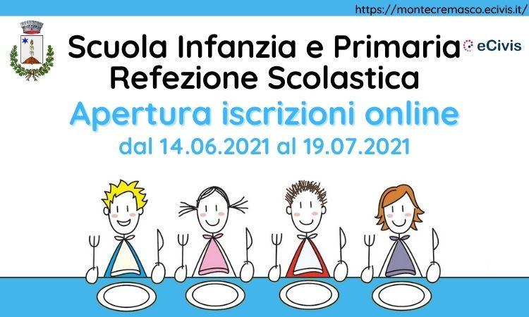 A partire dal 14 Giugno 2021 al 17 Luglio 2021 sono aperte le iscrizioni al servizio di “Refezione Scolastica a.s. 2021/2022”,per la scuola PRIMARIA e INFANZIA con modalità online.