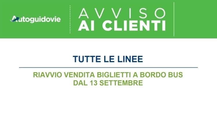 Si informa la Clientela che dal 13 Settembre sarà riattivato il servizio di vendita biglietti con sovrapprezzo a bordo bus.