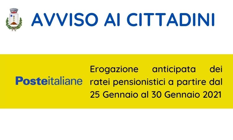 Si comunica che anche per il mese di Febbraio Poste Italiane procederà all'erogazione anticipata dei ratei pensionistici a partire dal 25 gennaio e fino al 30 gennaio, al fine di rendere più agevole, nell'attuale contesto di emergenza pandemica, la riscossione per tutti i pensionati