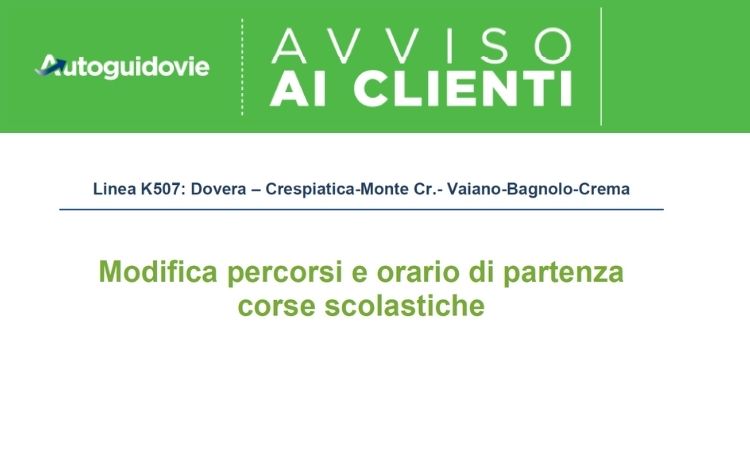 - Corsa ore 07:15 Crespatica - Monte Cremasco - Vaiano Cremasco - Bagnolo Cremasco - Crema giro H-Sraffa posticipata partenza ore 07:25 non transiterà più da Bagnolo Cremasco, dopo Vaiano Cremasc, S.S. 415 Paullese diretto Crema, ultima fermata in Vaiano "Vaiano Cremasco - Milano/I Maggio"