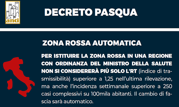 Share button Condividi Decreto PasquaTassonomia argomenti: ComunicazioneData Articolo: Lunedì, 15 Marzo, 2021 - 08:54CorpoDecreto Pasqua - Zona rossa automatica Galleria Allegati decreto_pasqua_file_anci.pdf (126.1 KB)