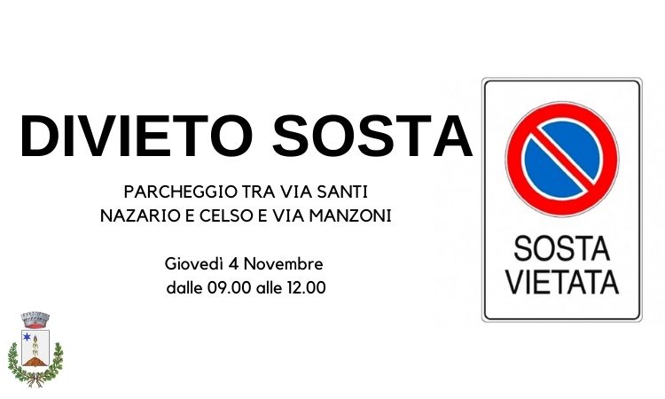 Il giorno 04 Novembre 2021 dalle ore 09.00 alle ore 12.00 in occazione della ricorrenza del IV Novembre e lìintitolazione "Largo Milite Ignoto" sarà vietata la sosta nel parcheggio posto tra la Via Santi Nazario e Celso e la Via Manzoni